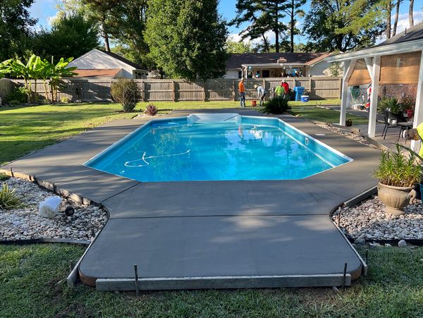 Poured concrete is the most popular – and usually most affordable – pool decking material. Concrete pool decks can be either broom finished or stamped. Broom finishing creates a standard concrete look. Different color and stamp options are available.